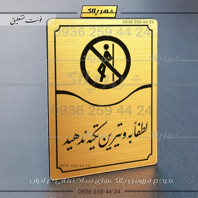 “تابلو مولتی لطفاً به ویترین تکیه ندهید” بصورت عمودی است و فرم مستطیل دارد؛ متن این پلاک به زبان فارسی در قسمت پایین و نشانک متن در بخش بالا قرار دارد؛ و یک خط منحنی متن و نشانک را از یکدیگر جدا کرده است.
