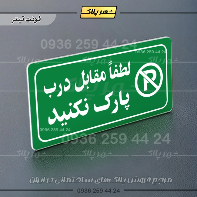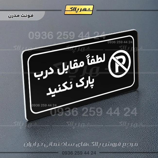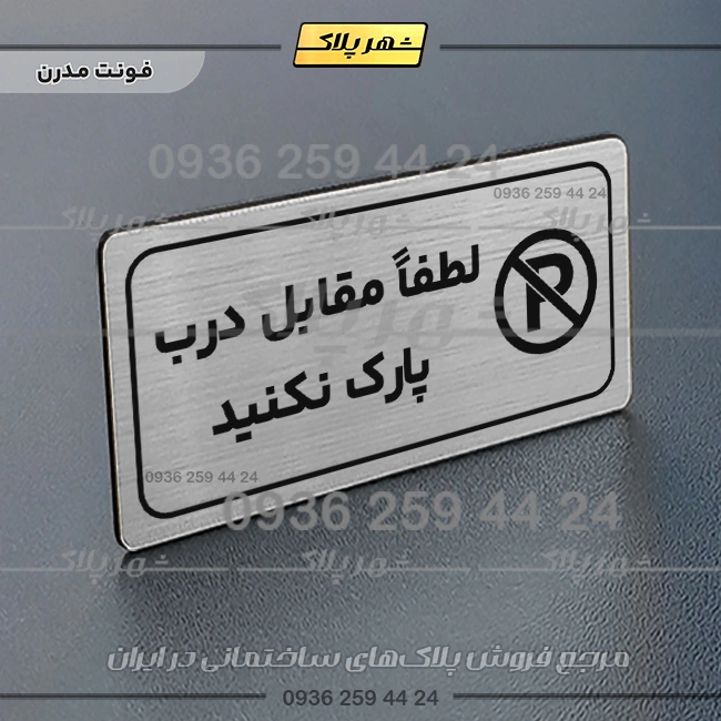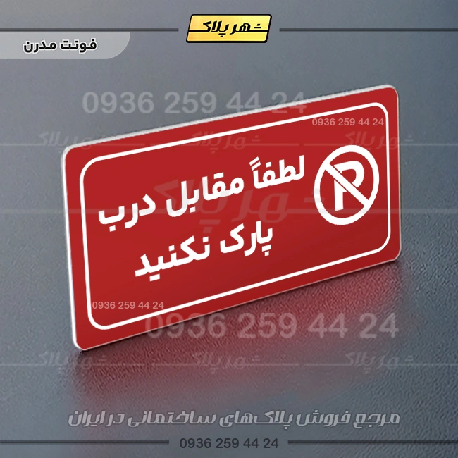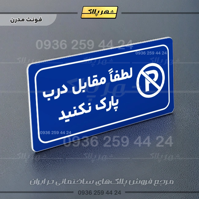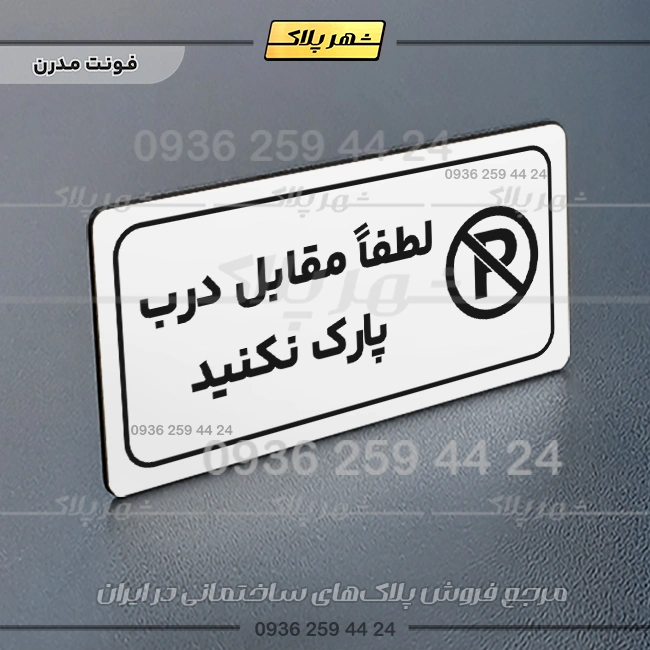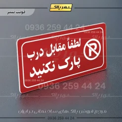 “پلاک مولتی راهنما لطفاً مقابل درب پارک نکنید” بصورت افقی است و فرم مستطیل دارد؛ متن این پلاک به زبان فارسی در سمت چپ و نشانک متن در سمت راست قرار دارد.