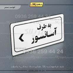 “تابلو لیزری به طرف آسانسور چپ” بصورت افقی است و فرم مستطیل دارد؛ این پلاک یک کادر ساده دارد و متن به زبان فارسی نوشته شده است.