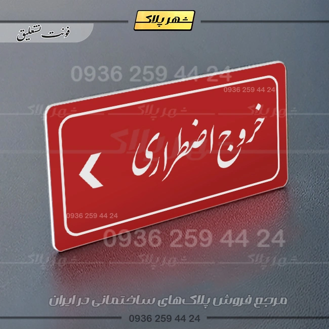 “تابلو لیزری خروج اضطراری به چپ” بصورت افقی است و فرم مستطیل دارد؛ این پلاک یک کادر ساده دارد و متن به زبان فارسی نوشته شده است.