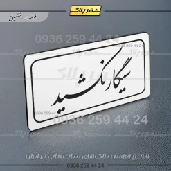 “تابلو لیزری سیگار نکشید” بصورت افقی است و فرم مستطیل دارد؛ این پلاک یک کادر ساده دارد و متن به زبان فارسی نوشته شده است.
