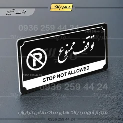 “تابلو پلاک راهنما توقف ممنوع“ بصورت افقی است و فرم مستطیل دارد؛ متن این پلاک به زبان فارسی در سمت راست، نشانک متن در سمت چپ و معادل انگلیسی متن در بخش پایین قرار دارد.