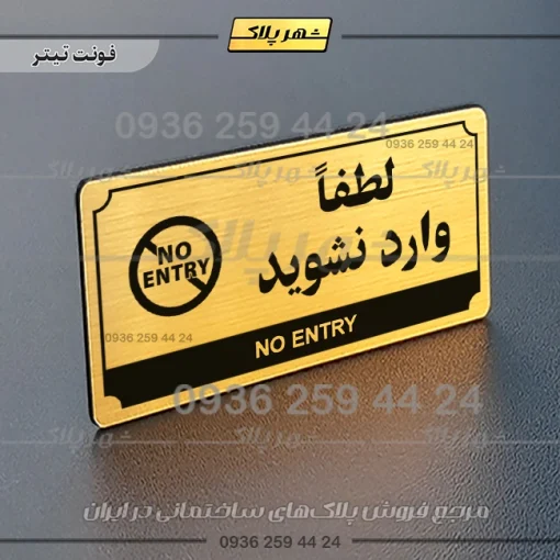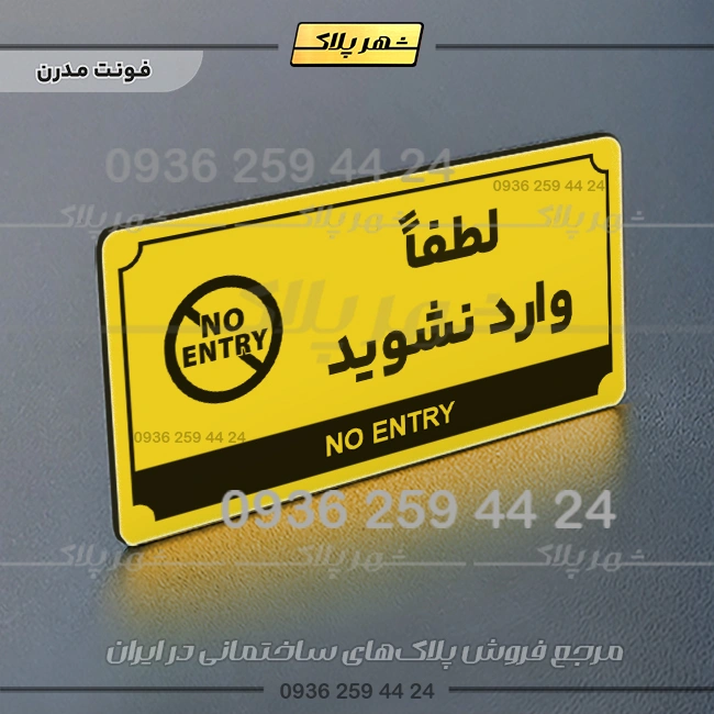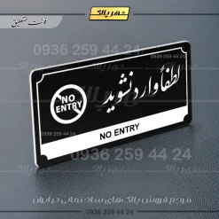 “تابلو پلاک راهنما لطفا وارد نشوید“ بصورت افقی است و فرم مستطیل دارد؛ متن این پلاک به زبان فارسی در سمت راست، نشانک متن در سمت چپ و معادل انگلیسی متن در بخش پایین قرار دارد.