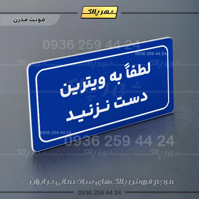 “تابلو لیزری لطفاً به ویترین دست نزنید” بصورت افقی است و فرم مستطیل دارد؛ این پلاک یک کادر ساده دارد و متن به زبان فارسی نوشته شده است.