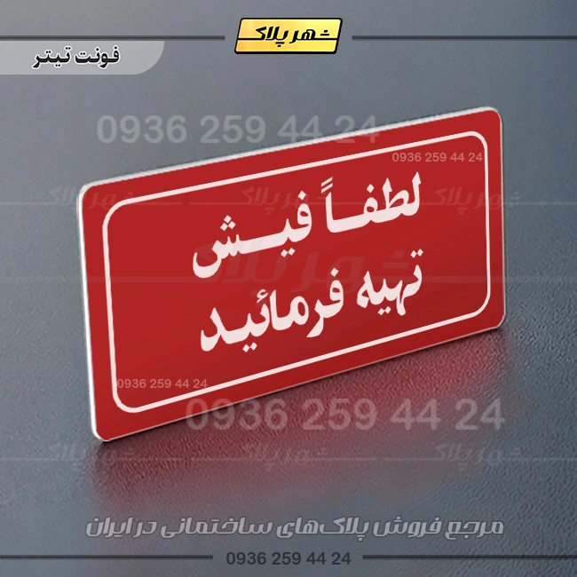 “تابلو لیزری لطفاً فیش تهیه فرمایید” بصورت افقی است و فرم مستطیل دارد؛ این پلاک یک کادر ساده دارد و متن به زبان فارسی نوشته شده است.