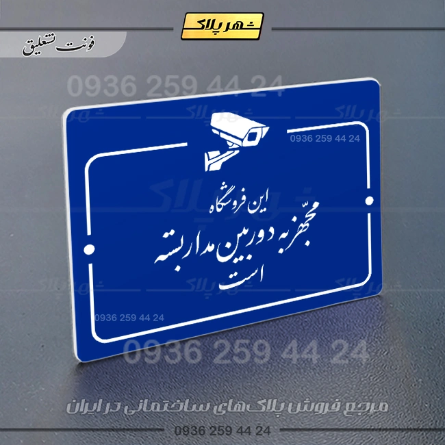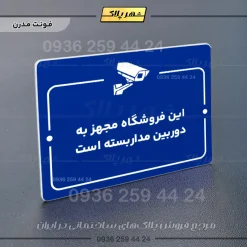 “پلاک راهنما این فروشگاه مجهز به دوربین مداربسته است” بصورت افقی است و فرم مربع مستطیل دارد؛ متن پلاک به زبان فارسی نوشته شده و نشانک متن در قسمت بالا قرار دارد.