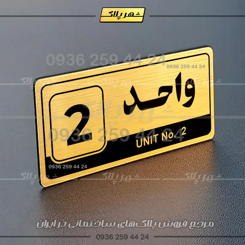 “پلاک شماره واحد 32” بصورت افقی است و فرم مستطیلی دارد. این پلاک بصورت دوبخشی است؛ عبارت واحد در سمت راست به زبان فارسی و شماره واحد در سمت چپ به انگلیسی و همچنین معادل انگلیسی شماره واحد در بخش پایین نوشته شده است.