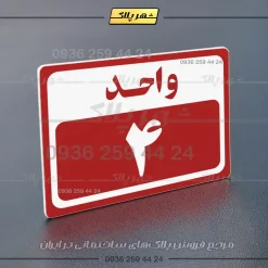 “پلاک شماره واحد 8” بصورت افقی است و فرم مستطیلی دارد؛ عبارت واحد در بخش بالا و شماره واحد به زبان فارسی در بخش پایین نوشته شده است.